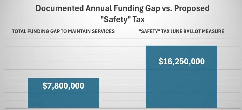 The chart below compares the City’s documented annual $7.8 million funding gap to the proposed $16+ million “Safety” parcel tax.