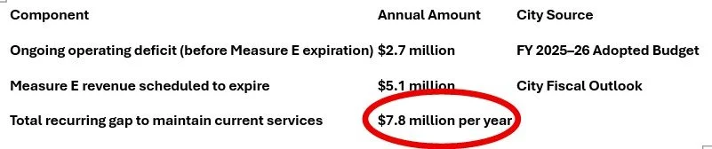 City budget documents show a recurring funding gap of roughly $8 million per year to maintain current service levels after Measure E expires.
